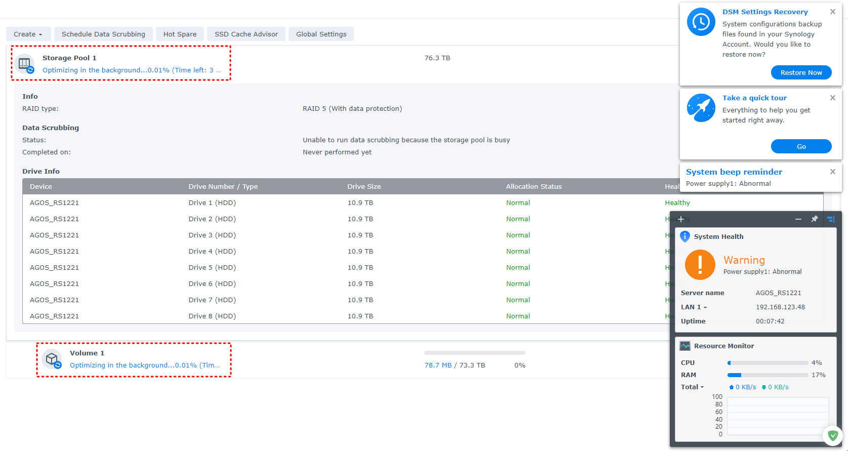 저는 비어있는 12TB의 하드 8개 기준 20시간 정도 시간이 잡혔습니다